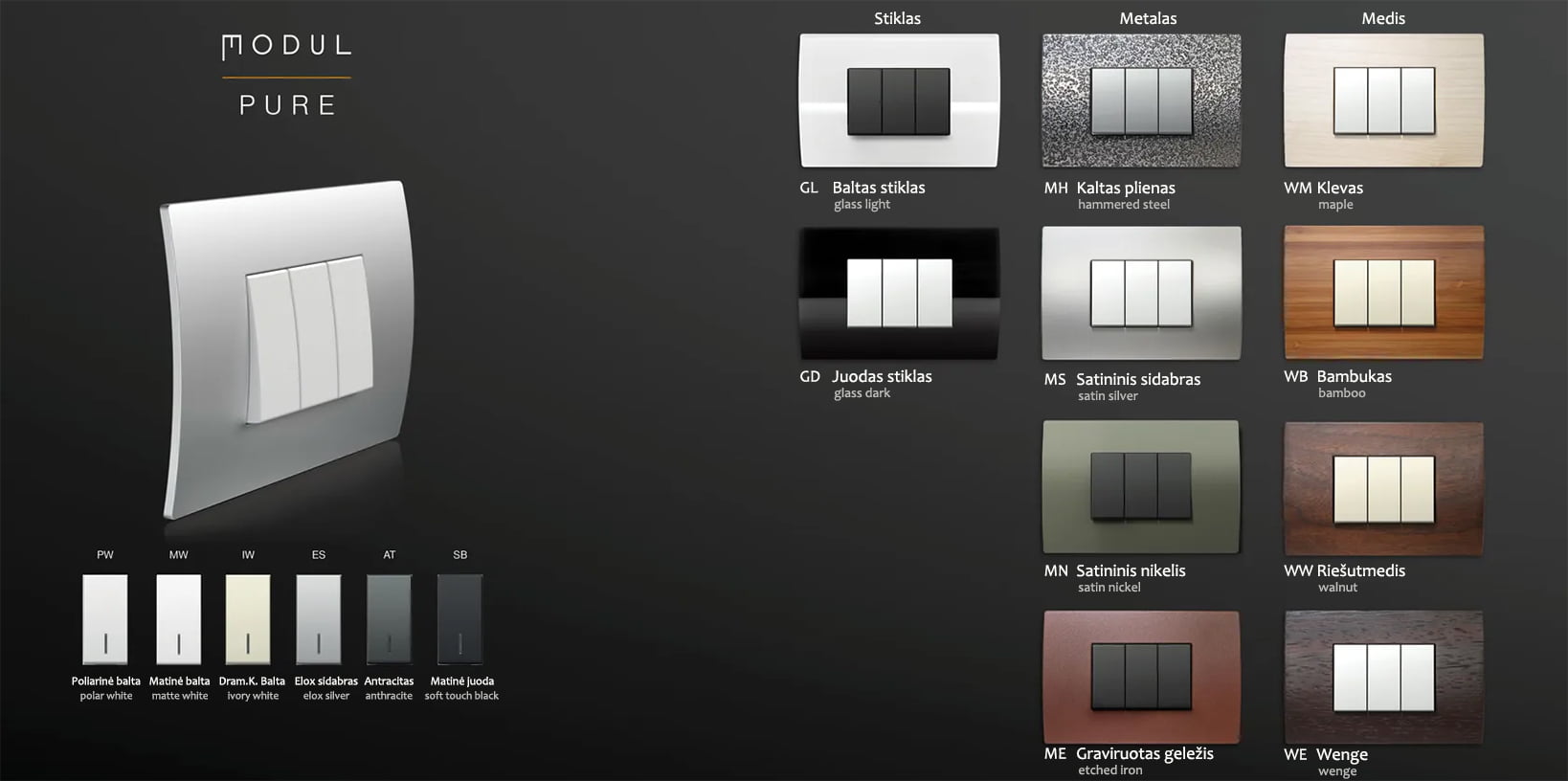 Pure switch linija išsiskiria natūraliomis medžiagomis: metalu, medžiu ir stiklu. Jo unikalus dizainas suteikia jai ypatingo prisilietimo.